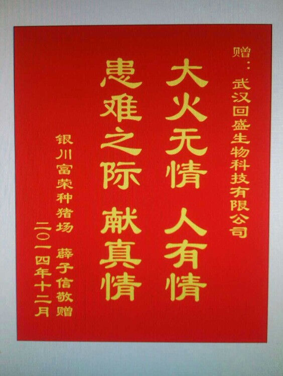 首先,請(qǐng)?jiān)试S我代表寧夏銀川富榮種豬場(chǎng)全體同事對(duì)回盛公司表達(dá)最衷心的感謝!2014年12月9日深夜兩點(diǎn),由于線路老化種豬舍不幸失火,直接損失經(jīng)產(chǎn)母豬88頭,后備母豬200頭,300多平米的種豬舍毀于一旦,經(jīng)濟(jì)損失達(dá)70萬(wàn)余。