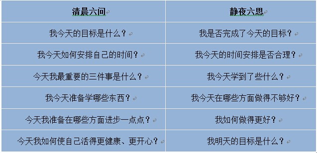 有公司管理人員專門設(shè)計了一個“員工每天自我思考六問六思”表,在很多企業(yè)運(yùn)行,并且反映效果不錯。