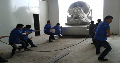 在新車間的設(shè)備安裝與定位的過程中,受一些不可避免因素的影響,很多棘手的困難總是突如其來。例如,新車間的功能間已隔離完畢,車間的外圍已封閉、定型。然而,外面的道路卻還沒有完全填平、硬化,那么怎樣將一臺6噸多重二維混合機(jī)準(zhǔn)確、安全定位?困難擺在眼前,大家聚集在一起,商討對策。用叉車,道路和門的尺寸都不夠高,叉車無法進(jìn)入;請吊車,車間外圍已封閉定型,吊車也愛莫能助!最終,大家提議利用滾動的方式對二維混合機(jī)進(jìn)行定位。