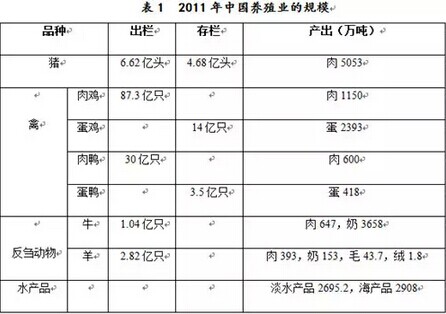 中國是世界上最大的食品動物養(yǎng)殖國,養(yǎng)殖規(guī)模大,養(yǎng)殖密度高,環(huán)境污染嚴(yán)重。據(jù)國家統(tǒng)計局,2011年中國肉類總產(chǎn)量7958萬噸、奶3810萬噸、禽蛋2811萬噸、毛類45.5萬噸、淡水產(chǎn)品2695.2萬噸,具體如表1所示。