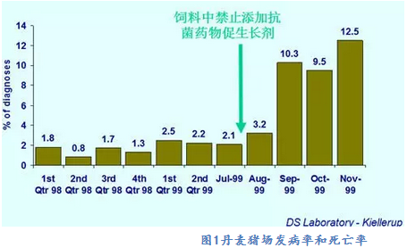 歐盟對獸用抗菌藥在養(yǎng)殖業(yè)上的使用要求比較嚴(yán)格。瑞典是最早在飼料中禁止添加抗菌藥物促生長劑的國家,從1999年7月1日起歐盟禁止桿菌肽鋅、螺旋霉素、維吉尼亞霉素和泰樂菌素4種抗生素在畜禽飼料中作為生長促進(jìn)劑使用,2006年1月1日起歐盟又禁止所有的抗菌藥物促生長添加劑在養(yǎng)殖業(yè)上使用。然而禁止使用抗菌促生長劑對動物健康和動物福利產(chǎn)生了很大的負(fù)面影響,丹麥DANMP的報道(2000年)指出禁用后丹麥豬場的發(fā)病率和死亡率增加了600%,如圖1所示。禁用后導(dǎo)致整個歐盟家禽的壞死性腸炎呈流行狀態(tài),飼料報酬下降,上市體重和整齊度降低,大大提高了生產(chǎn)成本。